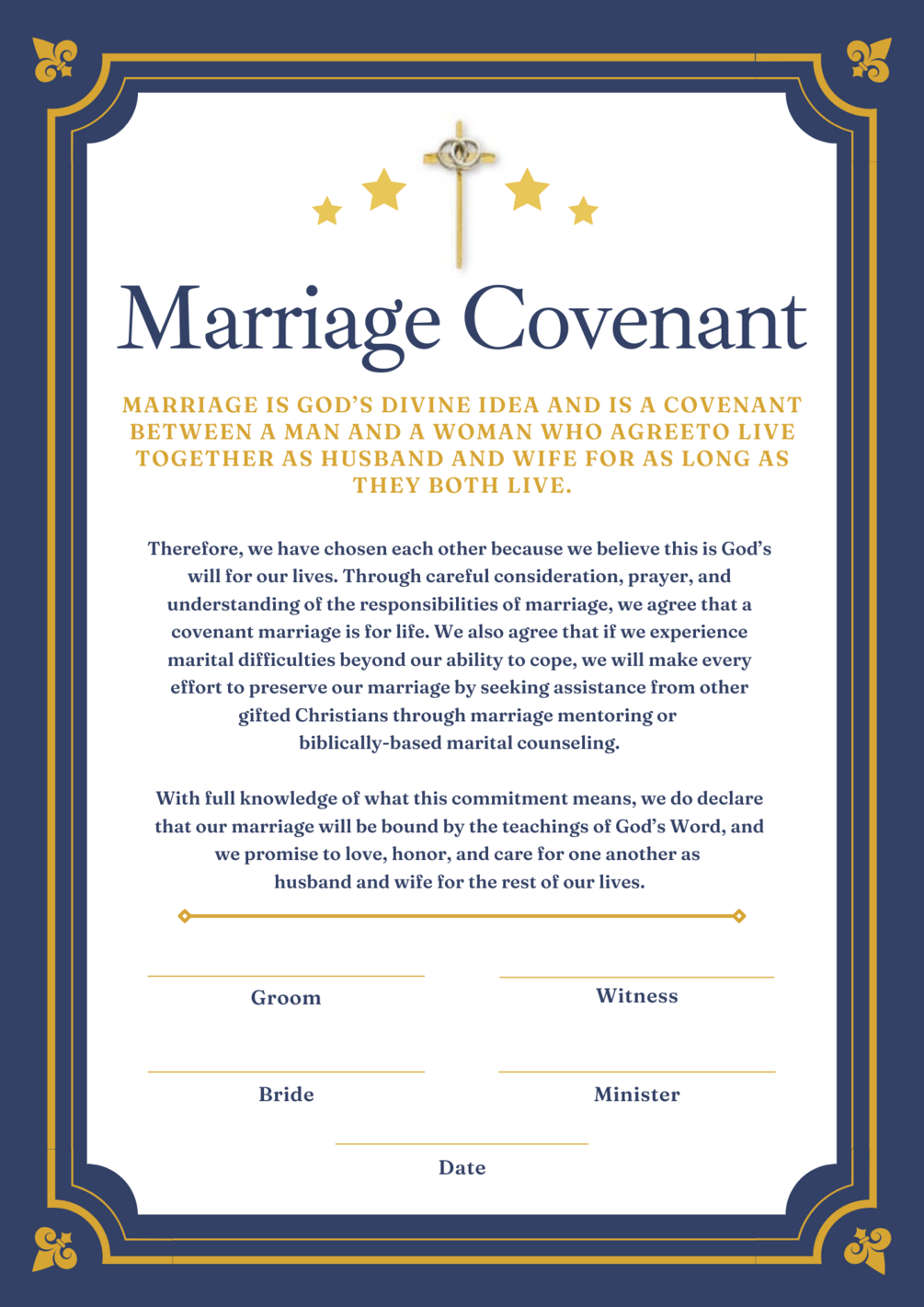 This Christian Marriage Covenant is a printable PNG document for those recently married and those who have been married for years. It is meant to strengthen the marriage bond as an agreement between the couple and God.
